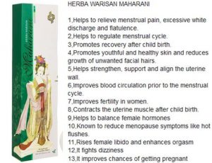 HERBA WARISAN MAHARANI PILLS is effective traditional herb rich in phytoestrogen improves the chances of pregnancy, tightens vaginal muscles, prevents gynecological diseases, relieves menstrual pain, regulates, the menstrual cycle and increases female libido.